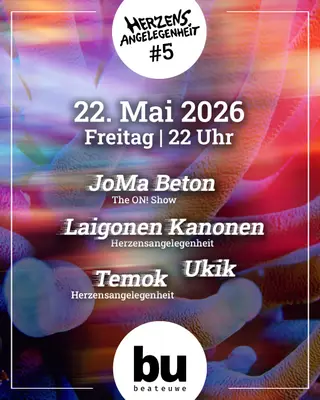 Herzensangelegenheit #5 takes place at Beate Uwe in Berlin, Germany, on May 22, 2026. This event will showcase the sounds of techno and tech house. The lineup features Joma Beton, an artist known for his contributions to the techno genre. His distinct style often incorporates elements of minimal techno, emphasizing rhythmic complexity and deep basslines.
