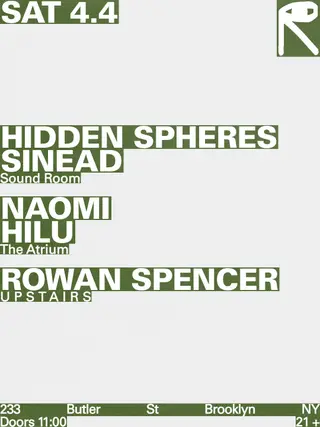 Hidden Spheres + Sinéad / Naomi + Hilu / Rowan Spencer takes place at public records in New York, United States on April 4, 2026. Featuring Hidden Spheres, Sinéad, Naomi (Berlin), Hilu. House sounds all night.