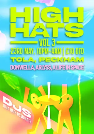 donwella and ARLYSS headline HIGH HATS VOL 3 at Tola, London, United Kingdom on May 23, 2026. Featuring donwella, ARLYSS, a life in space. House and Funk / Soul sounds all night.