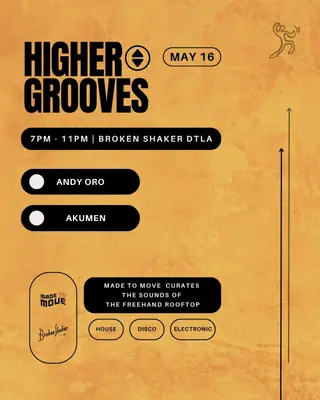Higher Grooves Rooftop Party on May 16, 2026 at The Broken Shaker Los Angeles, Los Angeles features Akumen and Andy Oro performing house DJ sets.
