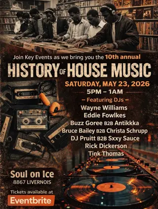 History of House Music on May 23, 2026 at Soul on Ice, Detroit features Wayne Williams, Eddie Fowlkes, Buzz Goree, Antikkka, Bruce Bailey and Tink Thomas performing house DJ sets.