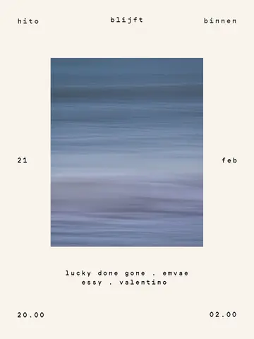 hito blijft binnen 2026 takes place at the renowned Hito Scheveningen in The Hague, Netherlands on Saturday, February 21, 2026, featuring Essy, Emvae, Lucky Done Gone and 0 more artists. This event brings together artists and fans who share a passion for dance music culture and House sounds.