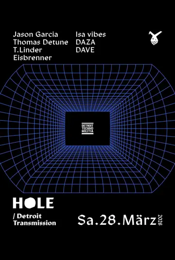 HOLE / Detroit Transmission takes place at Der Weiße Hase in Berlin, Germany on Saturday, March 28, 2026. Featuring T.Linder, Emanuel Eisbrenner, DAZA, DAV3. Techno, Industrial.