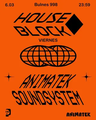 HOUSE BLOCK presenta ANIMATEK SOUNDSYSTEM all night long takes place at TBA - BULNES 998 in Buenos Aires, Argentina on March 6, 2026. Electro and Acid sounds all night.