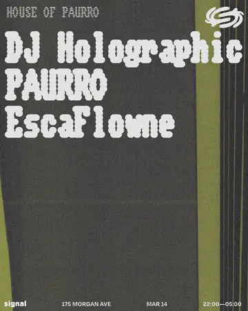 House Of PAURRO: DJ Holographic, PAURRO, EscaFlowne takes place at Signal in New York, United States on Saturday, March 14, 2026. Featuring DJ Holographic, PAURRO, EscaFlowne.
