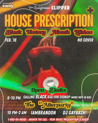 House Prescription: Black History Month Edition on February 18, 2026 at The California Clipper, Los Angeles features iamBrandon performing house DJ sets.