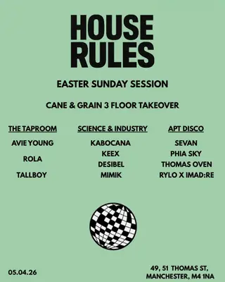 House Rules Cane & Grain Takeover takes place at APT Disco in Manchester, United Kingdom, on April 5, 2026. The lineup features imad:re, known for his blend of house and garage influences. Thomas Oven brings his unique take on house music, while PHIA SKY contributes her distinct sound within the garage genre. KABOCANA, an emerging artist, adds to the lineup with his house tracks. Tallboy is recognized for his energetic performances and garage beats, and RYLO (UK) rounds out the event with his contributions to the house scene. This event showcases house and garage music, highlighting a diverse range of styles from the artists involved.
