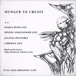 Hunger To Create takes place at Berghain | Panorama Bar | Säule in Berlin, Germany, on May 7, 2026. The lineup features Dasha Rush, a techno producer and DJ known for her experimental sound and contributions to the Russian electronic music scene. LIMEWAX, a drum and bass artist from Ukraine, is recognized for his intense and aggressive production style. Juliana Huxtable, an interdisciplinary artist and DJ, blends elements of techno and house, often exploring themes of identity and culture in her work. This event showcases genres including techno and drum and bass.