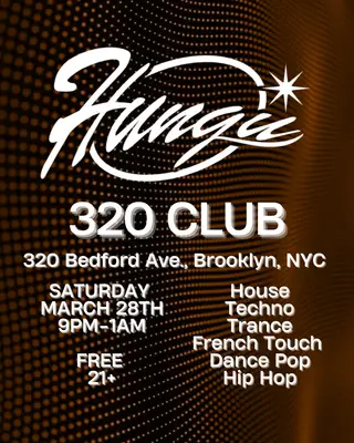 Set at 320 Club, Hungu 2026 brings together artists and fans in New York on Saturday, March 28, 2026, featuring Hungu. This event brings together artists and fans who share a passion for dance music culture and Techno, House sounds.