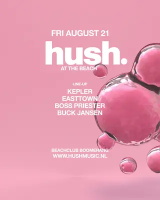 Hush at the Beach with Kepler, Easttown & More on August 21, 2026 at Boomerang Beach, The Hague features Kepler, Easttown and Boss Priester performing house DJ sets.