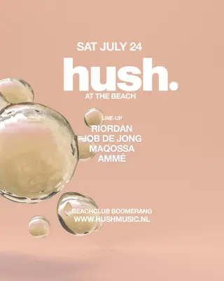 Hush at the Beach with Riordan, Job de Jong & More on July 24, 2026 at Boomerang Beach, The Hague features Riordan, Job de Jong, Maqossa and Ammé performing house DJ sets.