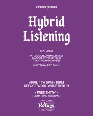 Hybrid Listening takes place at Refuge Worldwide / Niemetzstraße in Berlin, Germany on April 4, 2026. Featuring Two Thou. Ambient and Experimental sounds all night.