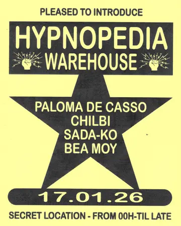 HYPNOPEDIA WAREHOUSE takes place at TBA in Miami, United States on Saturday, January 17, 2026. Featuring Bea Moy, Paloma de Casso.