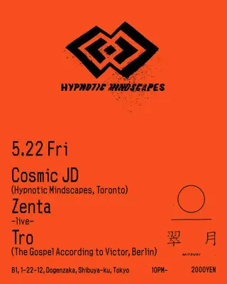 Hypnotic Mindscapes in Tokyo feat. Cosmic JD, Tro (live) and Zenta on May 22, 2026 at Mitsuki, Tokyo features Cosmic JD, Tro and DJ Zenta performing techno DJ sets.