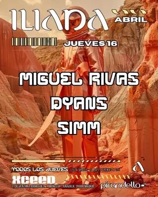 ILIADA CLUB + Miguel Rivas + Dyans + SIMM takes place at Sala Pirandelo in Madrid, Spain on April 16, 2026. Featuring Miguel Rivas, Dyans. Trance and Techno sounds all night.