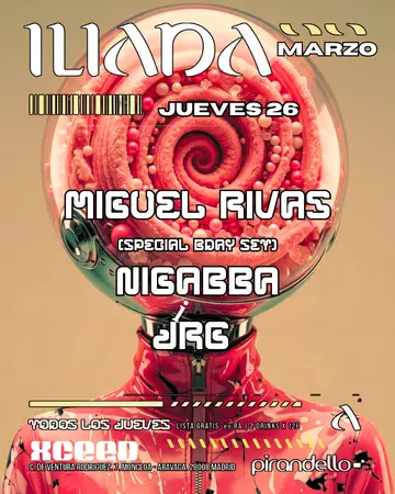 ILIADA CLUB + Miguel Rivas (SPECIAL BDAY SET) + JRG + Nigabba takes place at Sala Pirandelo in Madrid, Spain on Thursday, March 26, 2026. Featuring Miguel Rivas, JRG, Nigabba. Trance, Techno.
