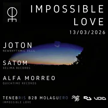 IMPOSSIBLE LOVE takes place at TBA - ENTITY POWDERED BY VOID ACOUSTICS in Miami, United States on Friday, March 13, 2026. Featuring Joton, Satom. Techno.