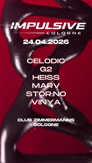 IMPULSIVE COLOGNE with CELODIC, G2, HEISS, MARV, STOR:NO, VINYA on April 24, 2026 at Club Zimmermanns, Cologne features electronic music performances techno DJ sets.