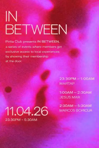 In Between is scheduled to take place at a venue to be announced in Madrid, Spain on April 11, 2026. The event features DJ Marcos Boricua, known for his contributions to the tech house genre. He has gained recognition for his distinctive sound, blending Latin influences with deep house elements. The event will showcase a lineup that emphasizes tech house and deep house genres, aligning with DJ Marcos Boricua's known style. Further details regarding additional artists and the venue will be available closer to the event date.
