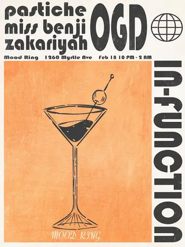 IN-FUNCTION takes place at Mood Ring in New York, United States on Wednesday, February 18, 2026. Featuring pastiche, miss benji, ogd (1), zakariyah.