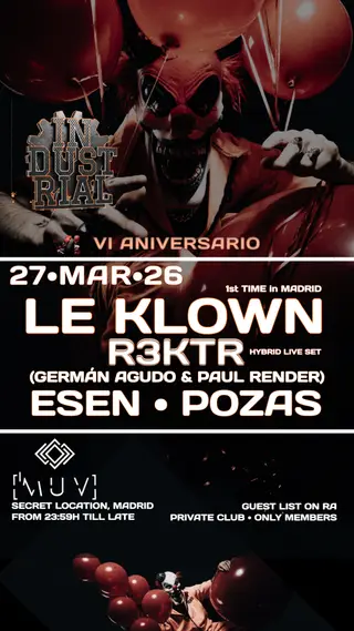 Industrial Mad (LE KLOWN) VI Aniversario on March 27, 2026 at Sala Muv, Miami features LE KLOWN, Germán Agudo, Paul Render and BUFAINE performing techno DJ sets.