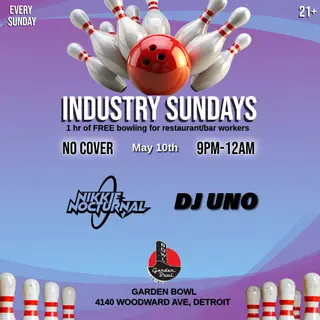 Industry Sundays takes place at Garden Bowl in Detroit, United States on May 10, 2026. House and Tech House sounds all night.