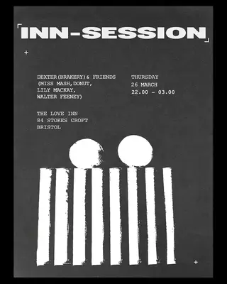InnSession with Dexter (Brakery) & Friends takes place at The Love Inn in Bristol, United Kingdom on March 26, 2026. Featuring Miss Mash, Donut. Experimental and Funk / Soul sounds all night.