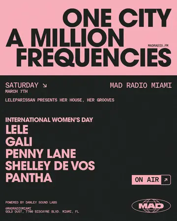 INTERNATIONAL WOMEN'S DAY: LELE, GALI, Penny Lane, SHELLEY DE VOS, PANTHA takes place at Mad Radio Miami in Miami, United States on Saturday, March 7, 2026. Featuring GALI, Penny Lane. House.