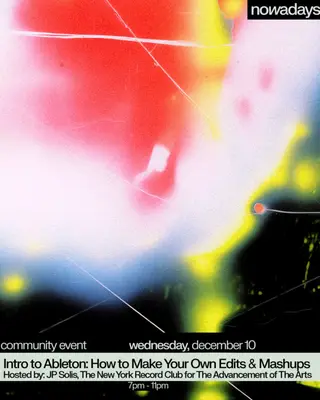 Intro to Ableton Lab: How To Make Your Own Edits and Mashups takes place at Nowadays in New York, United States on December 10, 2025. Featuring JP Solis, The New York Record Club for The Advancement of The Arts.