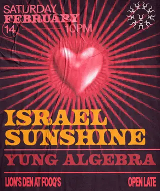Israel Sunshine + Yung Algebra on February 14, 2026 at Lion's Den, Detroit features Israel Sunshine and Yung Algebra performing DJ sets.