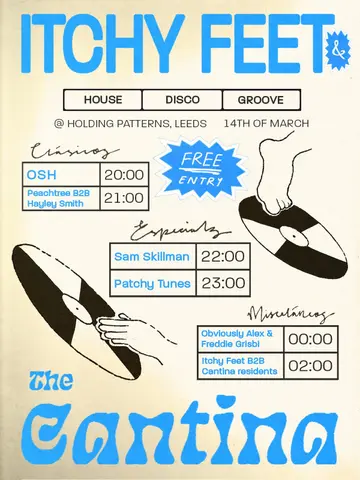 Itchy Feet presents: The Cantina takes place at Holding Patterns in Leeds, United Kingdom on Saturday, March 14, 2026. House, Disco.