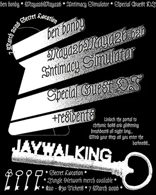 Jaywalking takes place at TBA - Secret Location in New York, United States on March 7, 2026. Featuring Ben Bondy, Intimacy Simulator, Special Guest DJ, jaql. Drum & Bass and Jungle sounds all night.