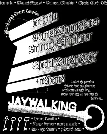 Jaywalking takes place at TBA - Secret Location in New York, United States on Saturday, March 7, 2026. Featuring Ben Bondy, Intimacy Simulator, Special Guest DJ, jaql. Drum & Bass, Jungle.