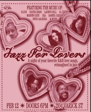 Jazz For Lovers: R&B Love Songs takes place at SOBs in New York, United States on February 12, 2026. Featuring Dijon. Jazz and R&B sounds all night.