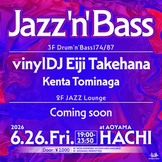 Jazz'N'Bass -Drum'n'Bass174/87 takes place at Aoyama Hachi in Tokyo, Japan on June 26, 2026. Featuring vinylDJ Eiji Takehana, Kenta Tominaga. Drum & Bass and Jungle sounds all night.