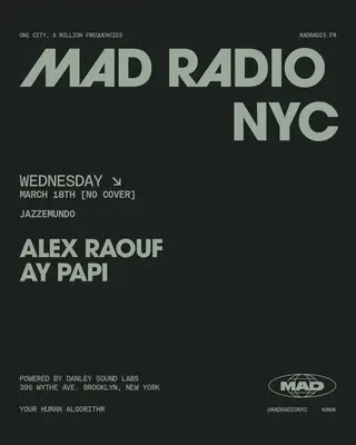 MAD Radio NYC in New York, United States hosts Jazzemundo - Alex Raouf / Ay Papi on March 18, 2026. Featuring Alex Raouf. Deep House and Jazz sounds all night.
