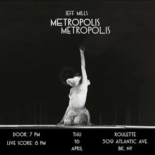 Jeff Mills Cinemix of Metropolis Metropolis on April 16, 2026 at Roulette, New York City features Jeff Mills performing techno DJ sets.