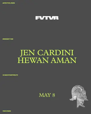 Jen Cardini, HAWAN AMAN on May 8, 2026 at Fvtvr, Paris features Jen Cardini and Hewan Aman performing house DJ sets.