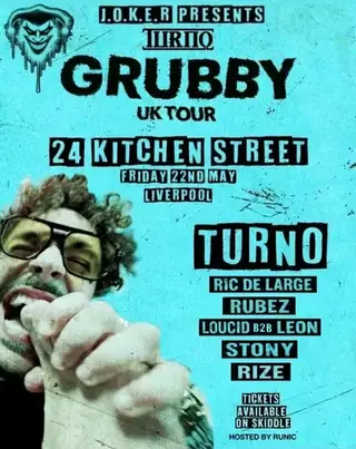 J.O.K.E.R Presents Turno Grubby Tour takes place at 24 Kitchen Street in Liverpool, United Kingdom on May 22, 2026. Featuring Turno, Ric de Large, Loucid, Leon. Drum & Bass and Jungle sounds all night.
