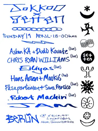 Jokkoo x setten Weekender - Day 2 takes place at TBA - Secret Location near Jannowitzbrücke in Berlin, Germany on April 19, 2026. Featuring Hans Arsen, Mooki6, Pasaporteman, Sara Persico. Experimental sounds all night.