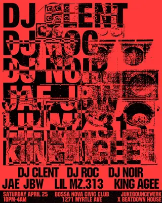 Juke Bounce Werk x Beatdown House on April 25, 2026 at Bossa Nova Civic Club, New York City features DJ Clent, DJ Noir and JAE JBW performing club DJ sets.