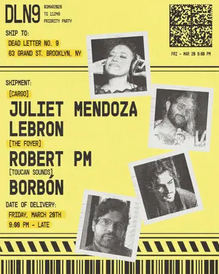 Juliet Mendoza, LeBRON, Robert PM, Borbón - Dead Letter No.9 takes place at Cargo @ Dead Letter No. 9 in New York, United States on March 20, 2026. Featuring Juliet Mendoza, LeBRON, Borbón, Robert PM. House and Disco sounds all night.