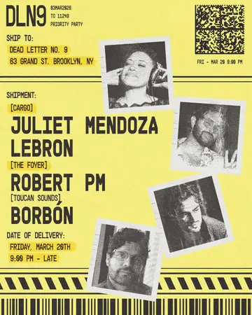 Juliet Mendoza, LeBRON, Robert PM, Borbón - Dead Letter No.9 takes place at Cargo @ Dead Letter No. 9 in New York City, Unknown on Friday, March 20, 2026. Featuring Juliet Mendoza, LeBRON, Borbón, Robert PM. House, Disco.