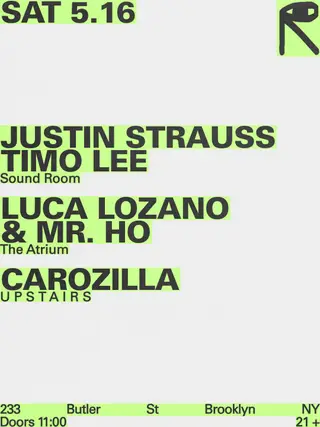 Justin Strauss, Timo Lee / Luca Lozano & Mr. Ho / Carozilla on May 16, 2026 at public records, New York City features Justin Strauss, Timo Lee, Luca Lozano, Mr. Ho and Carozilla performing house DJ sets.