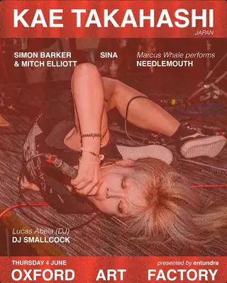 Kae Takahashi takes place at Oxford Art Factory in Sydney, Australia on June 4, 2026. Featuring Sina (AU), Marcus Whale, Lucas Abela. Experimental and Noise sounds all night.