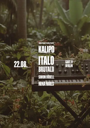 Set at gART.n, Kalipo presents: Garden of Synths (open-air daytime rave w. Italo Brutalo, Kalipo...) 2026 brings together artists and fans in Berlin on Saturday, August 22, 2026, featuring Kalipo and Italo Brutalo. This event brings together artists and fans who share a passion for dance music culture and House, Electro sounds.