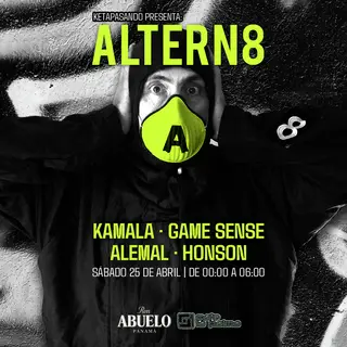 Ketapasando with Altern 8 takes place at Cafe La Palma in Madrid, Spain on April 25, 2026. Featuring Altern-8, KAMALA, Alemal, Honson (2). A blend of Techno and Electro.