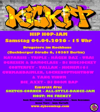 KICK IT Hip Hop-Jam takes place at Drugstore im Rockhaus in Berlin, Germany on April 4, 2026. Breakbeat and Hip-Hop sounds all night.
