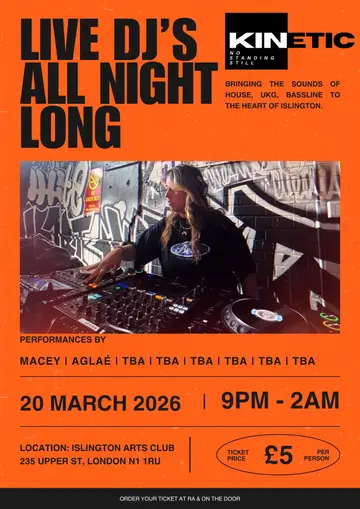 KINETIC - UKG, House, Bass 2026 takes place at the renowned Islington Arts Club in London, United Kingdom on Friday, March 20, 2026. This event brings together artists and fans who share a passion for dance music culture and Garage, Deep House sounds.