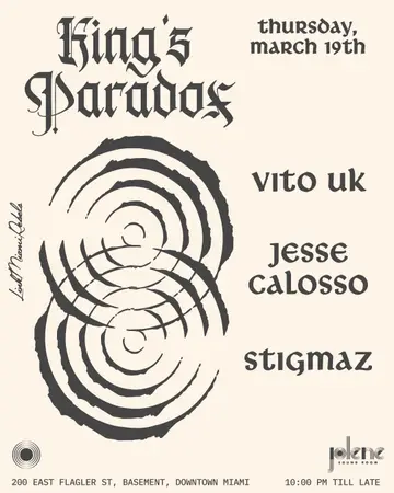 King's Paradox: Vito UK 2026 takes place at the renowned Jolene Downtown Miami in Detroit, United States on Thursday, March 19, 2026, featuring VITO (UK) and Jesse Calosso. This event brings together artists and fans who share a passion for dance music culture and House, Tech House sounds.